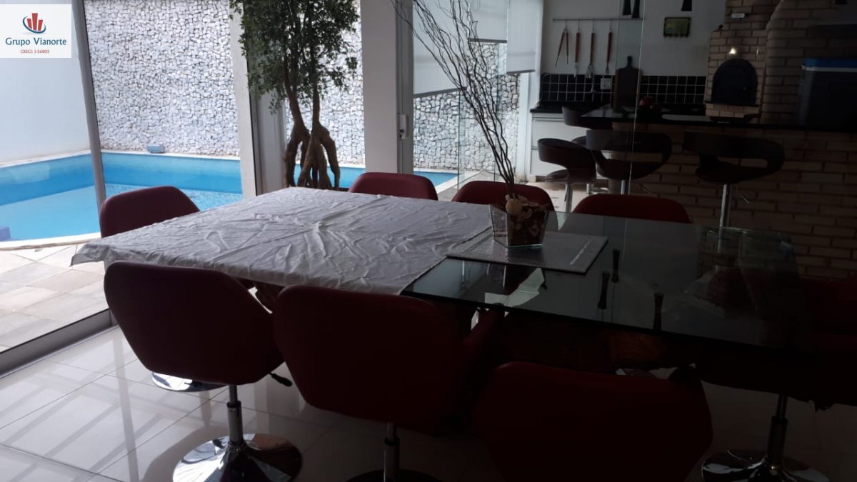 Área gourmet, piscina aquecida com cascata e hidromassagem, suíte de empregada, cozinha integrada com salas de jantar e estar.